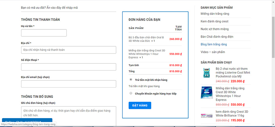 – Mua nhanh 1 sản phẩm thì click và nút mua ngay: điền thông tin đặt hàng, bấm vào đặt hàng ngay. Hoàn tất đơn đặt hàng, hình thức giao hàng COD, thời gian giao hàng 1 đến 3 ngày giao hàng trên toàn quốc, miễn phí ship cho tất cả các đơn đặt hàng