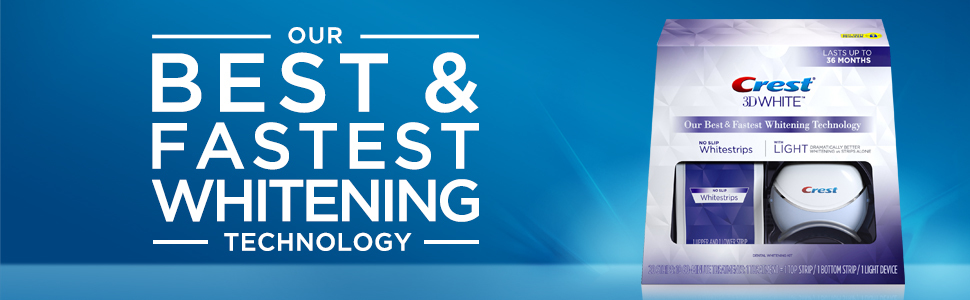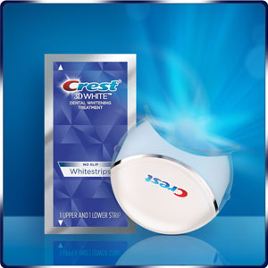 Crest 3D White Whitestrips là các dải làm trắng răng mỏng, linh hoạt được phủ cùng một loại gel làm trắng răng hiệu quả tương tự được sử dụng trong các văn phòng của nha sĩ. Các dải được thiết kế phù hợp với hình dạng răng của bạn và sử dụng công nghệ Advanced Seal để giữ gel làm trắng an toàn. Sau 60 phút sử dụng, thiết bị ánh sáng cầm tay được sử dụng trong khoảng 10 phút, cho phép ánh sáng xanh được thiết kế đặc biệt xuyên qua bề mặt men răng. Điều này làm giảm các vết ố vàng tạo ra kết quả nhanh hơn, trắng hơn.