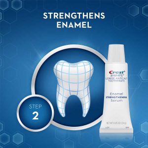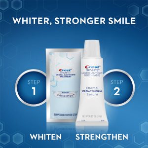 Bộ dụng cụ làm trắng răng + trị liệu kem đánh răng serum. Hệ thống hai bước này hoạt động để làm trắng răng và bảo vệ nuôi dưỡng men răng của bạn chỉ trong 30 phút sau mỗi lần điều trị. Các miếng dán đã được thiết kế đặc biệt để làm trắng nhẹ nhàng, chuyên dùng làm trắng cho răng nhạy cảm và yếu. Bước 1: Miếng dán Crest 3D White cung cấp các thành phần làm trắng tương tự mà các nha sĩ sử dụng, để bạn có thể loại bỏ các vết bẩn lên đến sáu năm mang đến nụ cười trắng đẹp.