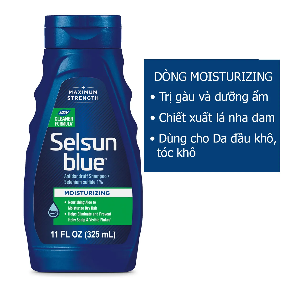 Dầu gội Selsun Blue Moisturizing với Aloe (Nha đam) dung tích 325ml (11oz) là một trong những dòng sản phẩm chăm sóc da đầu phổ biến nhất tại Mỹ, đặc biệt dành cho những người gặp vấn đề về gàu nhưng có da đầu khô hoặc tóc dễ bị xơ rối.