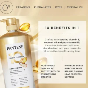 Dầu xả Pantene The Multi Tasker 10 in 1 Conditioner dung tích 1.13L, nhập khẩu từ Mỹ, là sản phẩm chăm sóc tóc đa năng mang đến 10 lợi ích vượt trội chỉ trong một bước sử dụng. Được phát triển với công thức đặc trưng của Pantene, kết hợp cùng các dưỡng chất quý giá như Keratin, Vitamin E và dầu dừa, sản phẩm này được thiết kế để giải quyết nhiều vấn đề về tóc, giúp mái tóc khỏe mạnh, mềm mượt và óng ả.