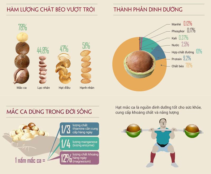 Thành phần hữu ích chính của quả mắc-ca là phần nhân – được xếp vào hàng thượng phẩm trong “kho hạt” phong phú của xứ sở bánh ngọt phương Tây.