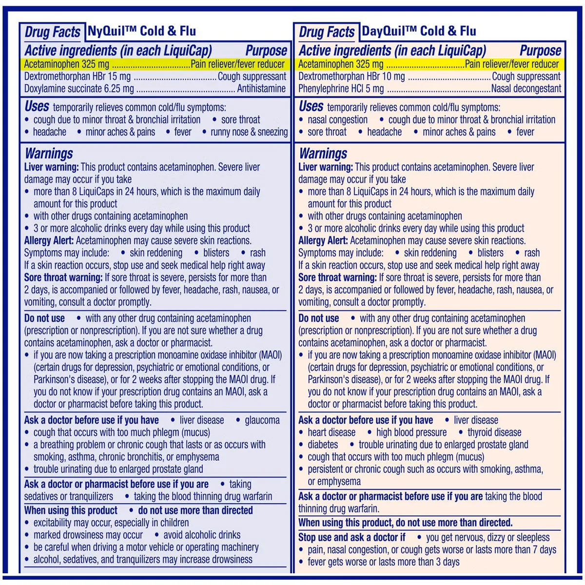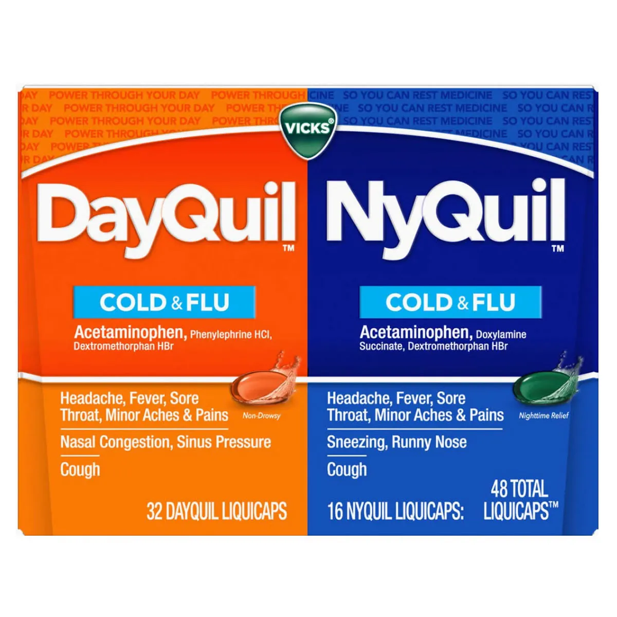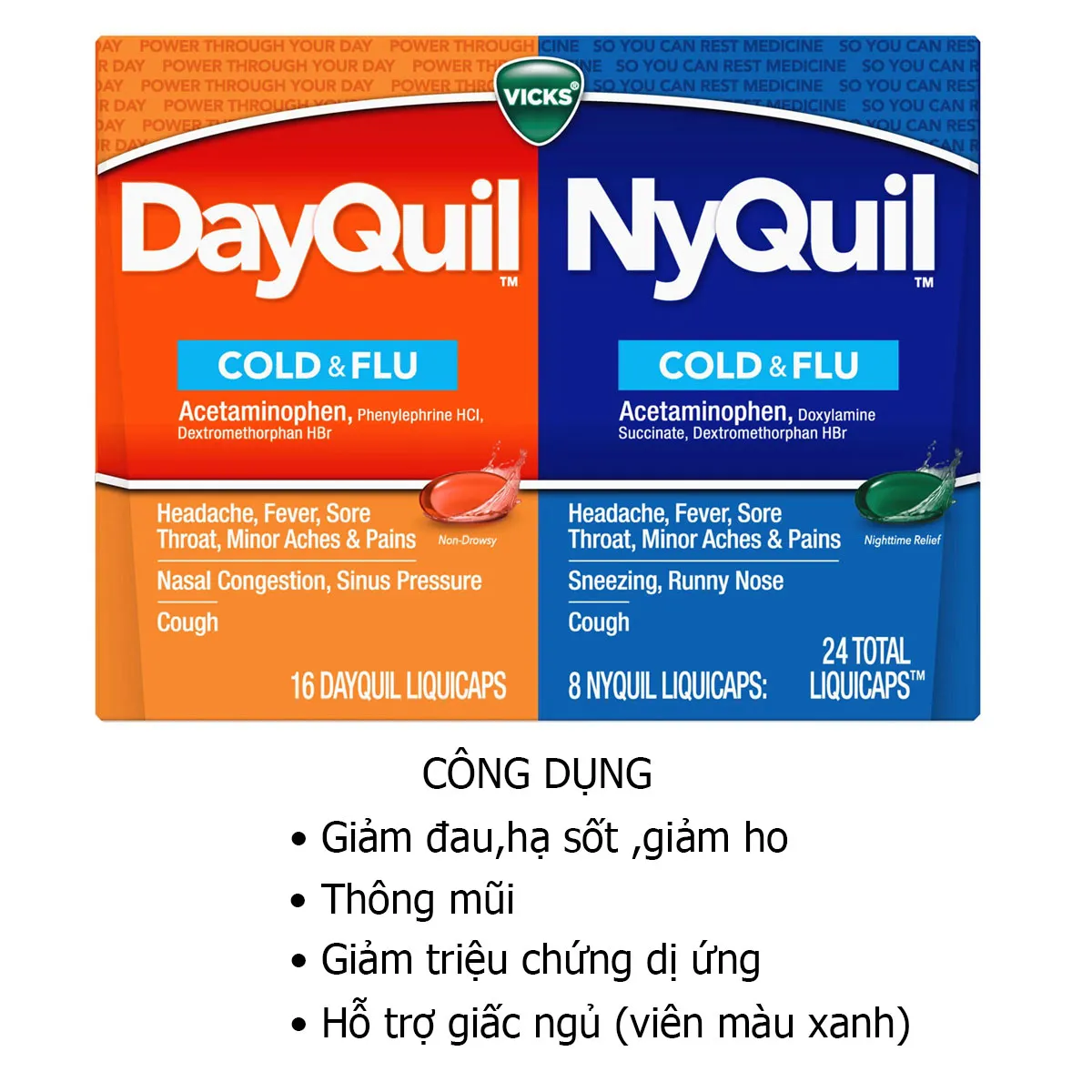 Viên uống Vicks DayQuil & NyQuil Cold & Flu là bộ sản phẩm phổ biến của Mỹ dùng để giảm các triệu chứng cảm cúm. Hai loại này có công thức khác nhau để phù hợp với nhu cầu sử dụng vào ban ngày (cần tỉnh táo) và ban đêm (cần nghỉ ngơi).