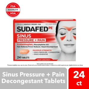 Viên uống hỗ trợ viêm xoang Sudafed PE Sinus của Mỹ là một sản phẩm được biết đến rộng rãi, thường được sử dụng để giảm các triệu chứng liên quan đến xoang và nghẹt mũi.