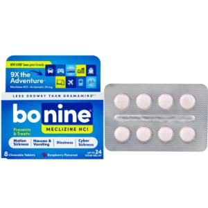 Bonine vị mâm xôi 8 viên là một loại thuốc không kê đơn của Mỹ, được dùng để ngăn ngừa và điều trị các triệu chứng say tàu xe như buồn nôn, nôn và chóng mặt. Thành phần hoạt chất chính trong Bonine là Meclizine Hydrochloride.